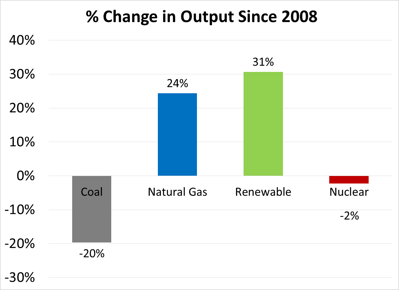 The amount of fossil fuel energy used to generate electricity has declined by 9% while total electric output has been flat. This likely is the beginning of a long-term transition away from fossil fuels. The trend will be furthered over the next few years by increasing development of renewable projects and the opening of multiple new nuclear units in the U.S. Certainly there is still an open question of how far we can go in generating electricity from non-fossil fuels, but it is clear that a movement in that direction in underway.
